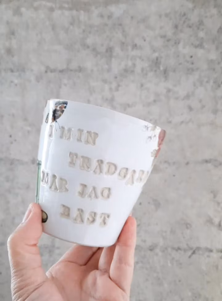 Föreställ dig att njuta av en lugn stund i trädgården med en vacker, handgjord keramikmugg i handen. Denna mugg är dekorerad med fina blommotiv och har texten I MIN TRÄDGÅRD MÅR JAG BÄST stansad på den handdrejade muggen som inspirerar till reflektion och välmående.