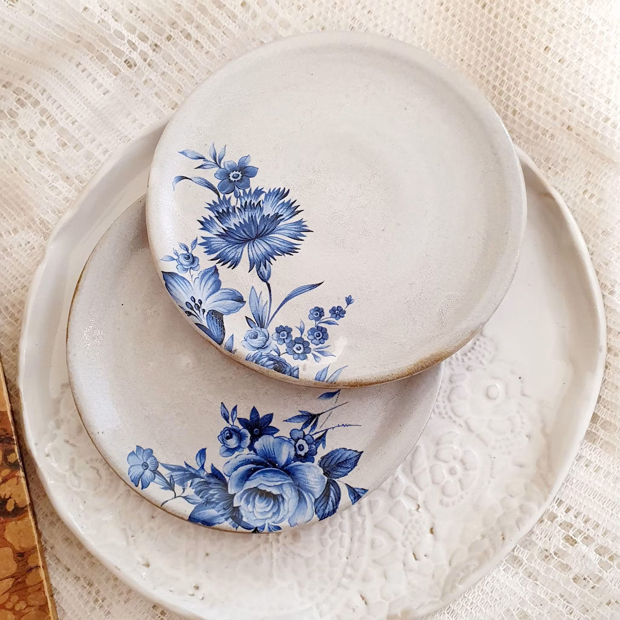 Vilket motiv du får när du beställer blir en överraskning för dig och beställer du hem fler fat är motiven olika men det är liknande fat och liknande blå blomsterdekoration. Vill du ha fantastiskt fina keramikmuggar till faten hittar du det här. Faten tål diskmaskin