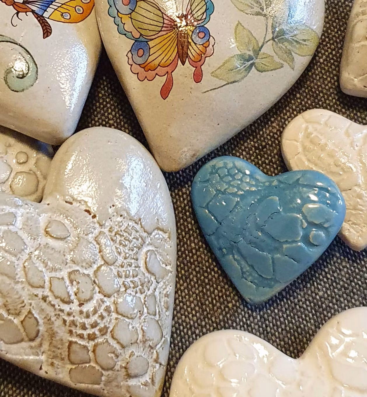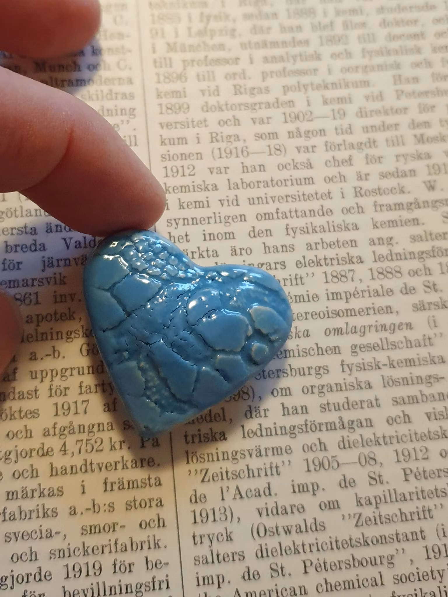 Minihjärta i blå ton. Mönstret i hjärtat är tryckt av virkad duk. Så sött och blått!