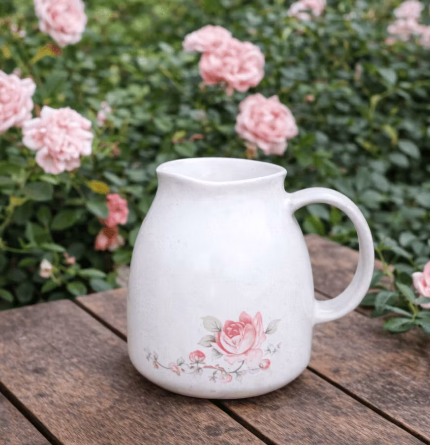 Stora vackra nyponrosor dekorerar kannan i keramik. Och så klart måste det finnas en fjäril som flyger från ros till ros. Så underbart vacker kanna att fylla med grädden till kaffet eller mjölken till teet. Kanske att du fyller den med såsen till söndagssteken.