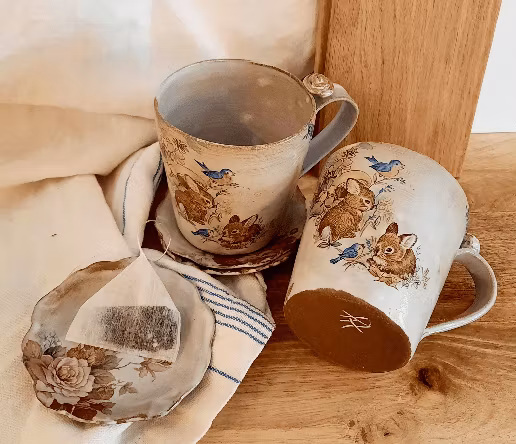 Handdrejad keramikmugg som pryds med bedårande kaninmotiv för tankarna till en idyllisk landsbygd. Den unika koppen är inte bara ett hantverk - den är också ett konstverk. Kaninmuggen är perfekt för den som uppskattar detaljer och vill ha inredningsdetaljer som speglar personlighet och charm. Som en present till en som bara ÄLSKAR kaniner.