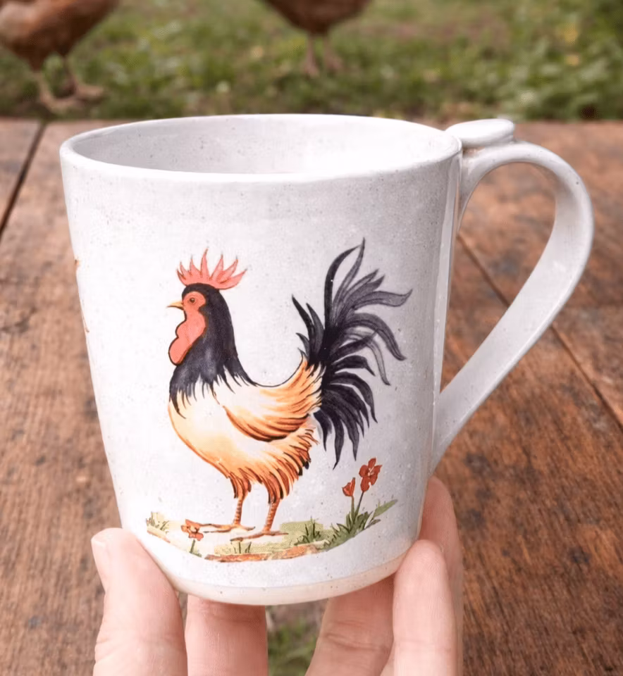 Välkomna morgonen med våra charmiga tuppmuggar! Dessa härliga muggar är dekorerade med stolta tuppar som ger en lantlig och hemtrevlig känsla. Perfekta för att njuta av ditt morgonkaffe eller te medan du hör tuppen gala i bakgrunden. Om du har egna hönor och tuppar, eller om du helt enkelt bara älskar dessa fantastiska djur, kommer dessa muggar att bli en favorit i ditt kök.